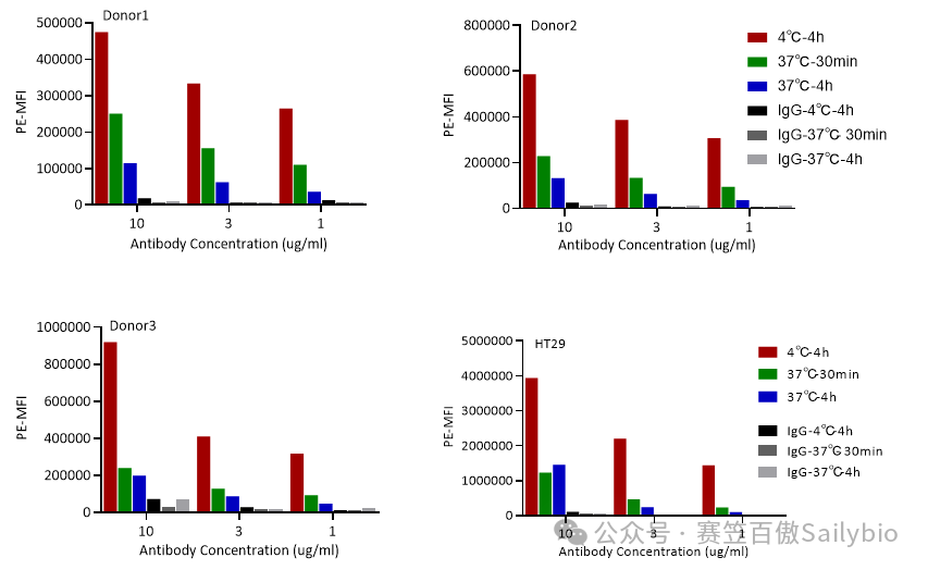 将中性粒细胞或HT29细胞(阳性对照细胞)分别与待测分子或阴性对照分子共孵育后,使用流式细胞仪检测结合在中性粒细胞或者HT29表面的剩余待测分子荧光强度:对比阴性对照分子,待测分子1和待测分子2在37℃孵育条件下,均可被HT29或不同donor的中性粒细胞内吞,且随孵育时间增加(0.5h-4h),内吞效果明显增加。